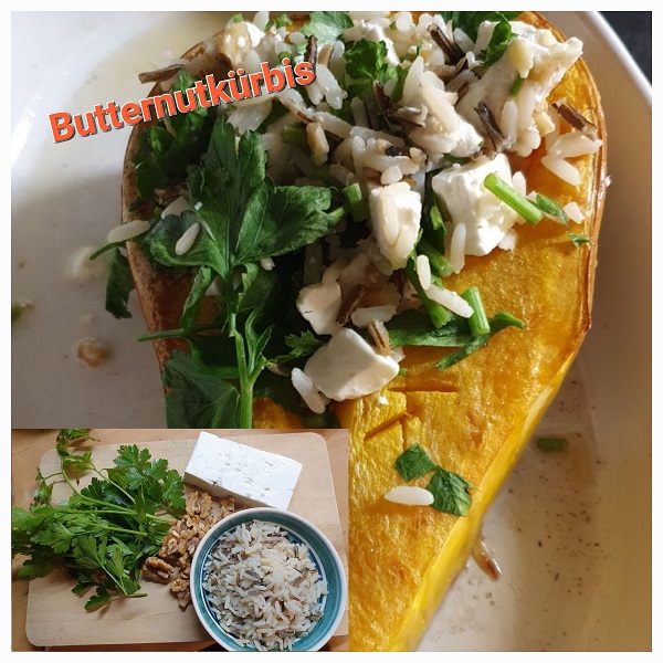 Walnüsse, Schafskäse und Petersilie klein gehackt mit dem gekochten Reis mischen und in den Butternutkürbis füllen – Ca. 20 Minuten überbacken.
