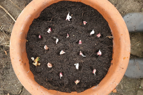 Aus der Küche in den Pflanztopf. Wenn der Knoblauch schon ankeimt und man ihn nicht mehr in der Küche verwenden will…